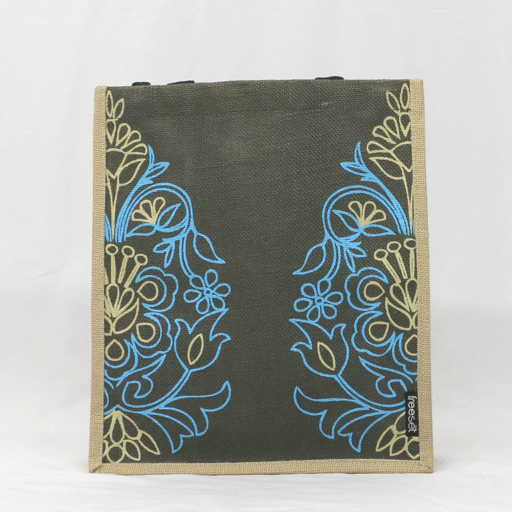 Carry your essentials in style with this eco-friendly screen printed bag featuring a beautiful blue and brown floral design. The laminated jute material ensures durability while the soft cotton handles and shoulder strap provide comfortable carrying options. Keep your phone or wallet safe in the internal pocket with a velcro closure. Plus, feel good knowing that the bag was made by the empowered women at Joyya who have left the sex industry and gained sustainable employment with dignity and respect in their communities.