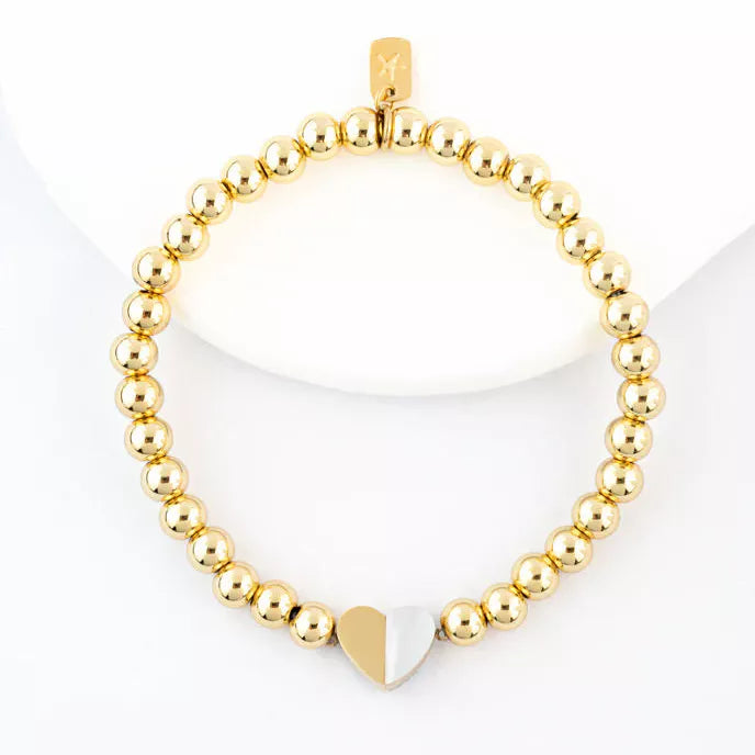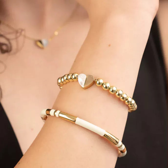 Our beloved Give Hope style is now available as a stunning 18K gold-plated, hand-beaded stretch bracelet! Elevate your stack or find the perfect gift with this luxurious 18K gold-plated ball bracelet featuring a mother-of-pearl "Give Hope" heart pendant.