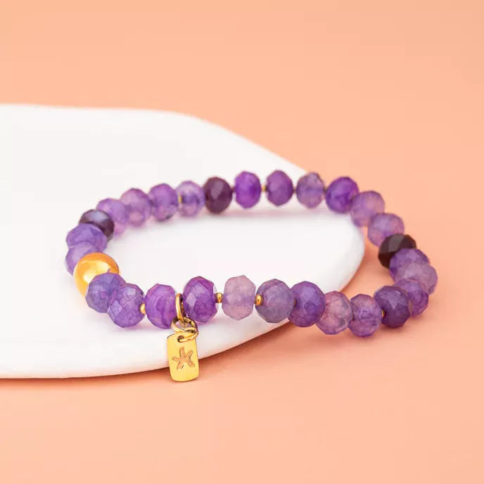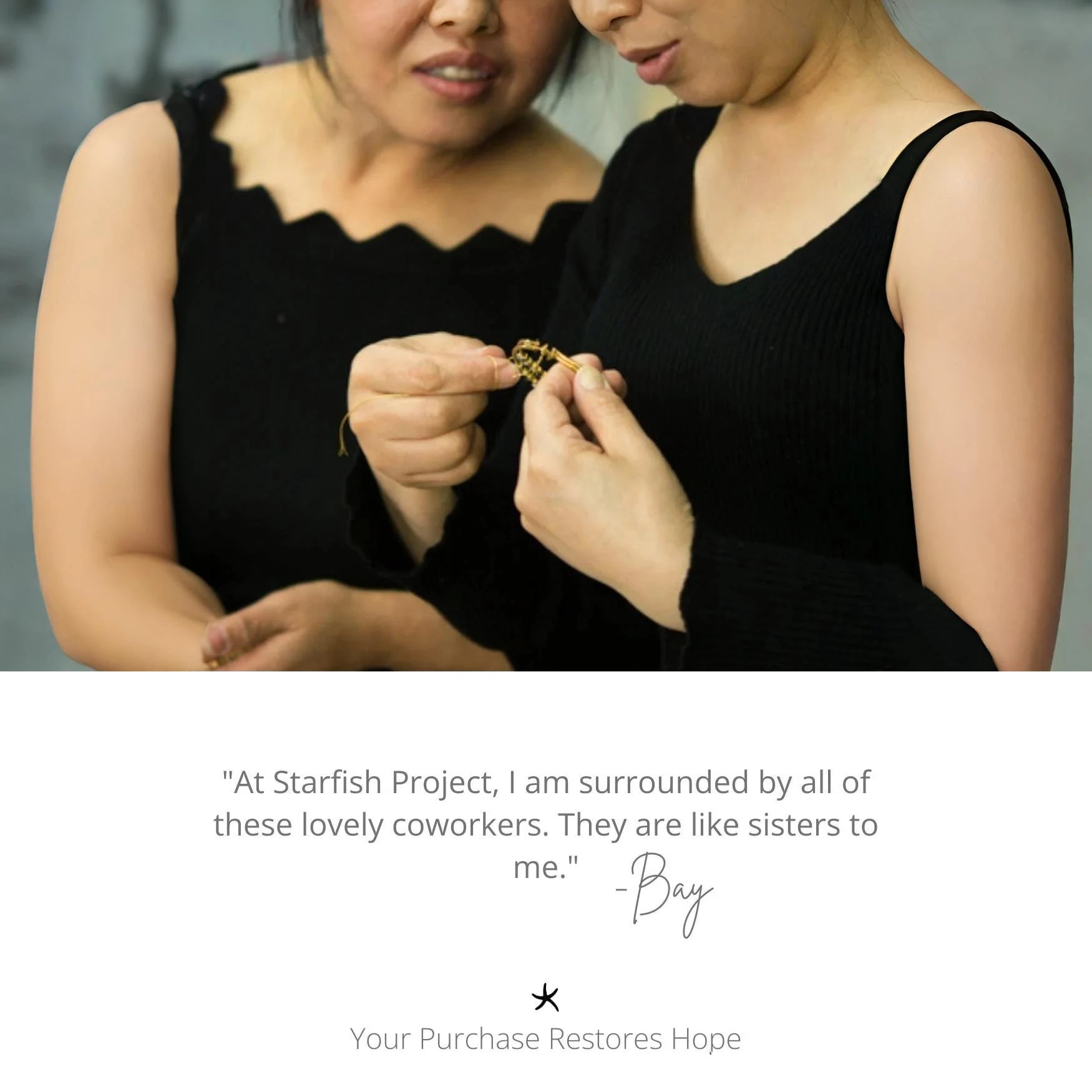 Our new stunning purple beaded bracelet is inspired by Lan, who shares, “I jumped at the opportunity to change my life and be a good example for my son. I am so grateful for this opportunity to rebuild my life again here at Starfish Project.” The light-reflecting beads celebrate the beauty and strength of community as each agate bead brings out the stunning violet hues of the next, surrounding the shining 14K gold-plated accent and starfish charm. Wear and gift our Lan Bracelet to celebrate your community of encouragers and know that you are part of Lan’s. Thank you.