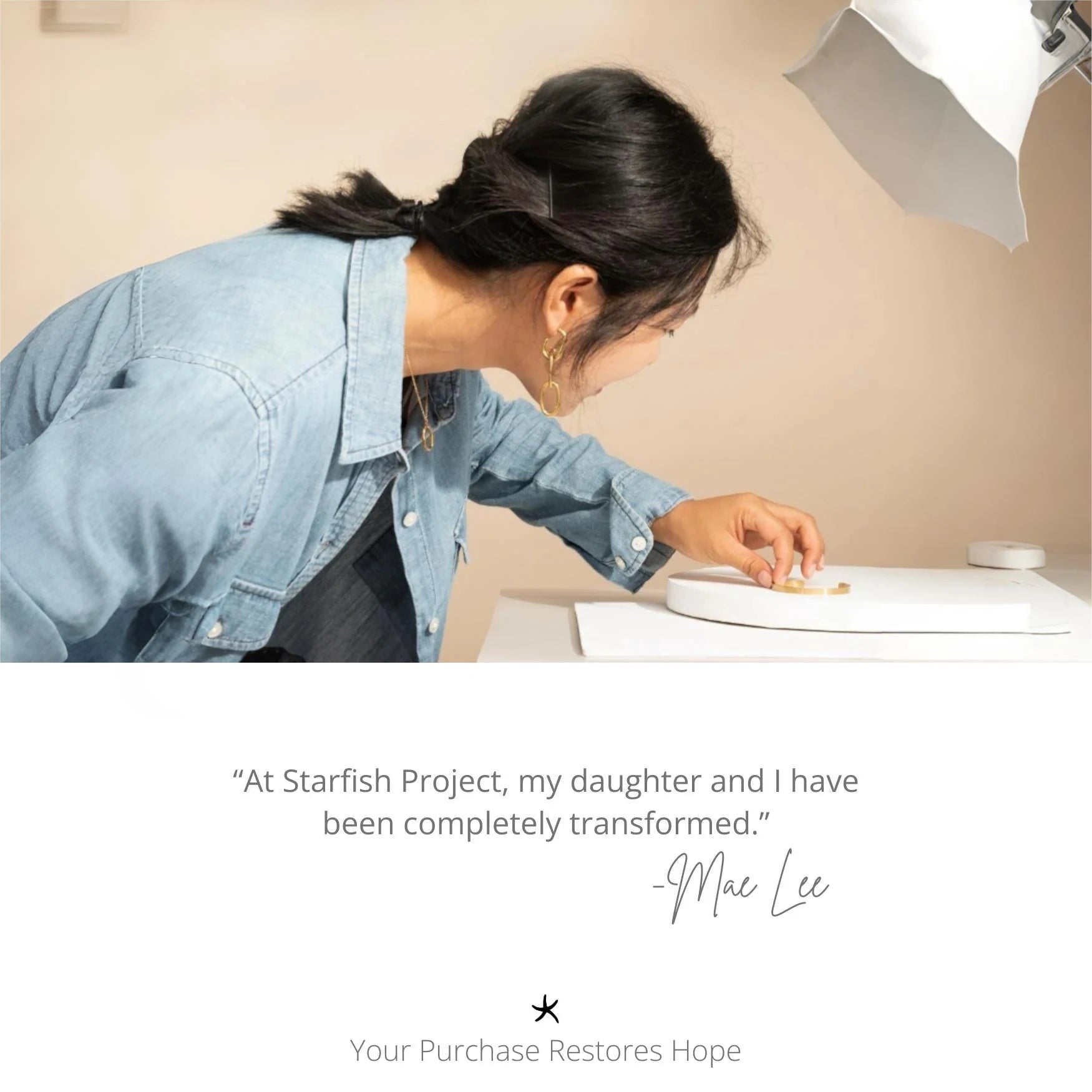 Inspired by the iconic Starfish Parable, these delicate starfish stud earrings, crafted in 14k plated gold, are a symbol of hope and the power of individual action. Just as the boy, though small, makes a difference by returning washed-up starfish to the sea, we believe that every small act of kindness can have a ripple effect. These earrings are a reminder of the importance of making a positive impact, no matter how small. As the Starfish Parable inspired our brand name, the Starfish Hope Studs are a testament to your impact on each survivor experiencing freedom at Starfish Project.